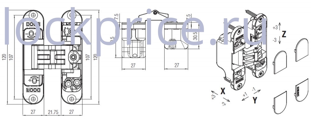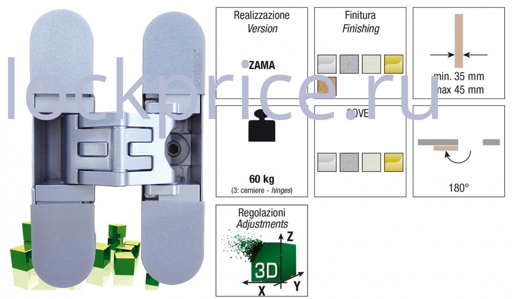 Скрытые универсальные петли KRONA KOBLENZ KOBLENZ KUBICA 27 - K2700 с 3D регулировкой обеспечивают внешнюю привлекательность, надежность и функциональность. Изготовлены из сплава ЦАМ (цинк - алюминий - медь). Имеют декоративные крышки лицевой части петли в основной цвет изделия, которые закрывают саморезы. Предназначены для монтажа в дверные блоки без наличника и притвора. Максимальная нагрузка на 2 петли - 45 кг; на 3 петли - 60 кг; минимальная толщина дверного полотна - 35 мм; максимальная толщина дверного полотна - 45 м; максимальный угол открывания двери - 180°.