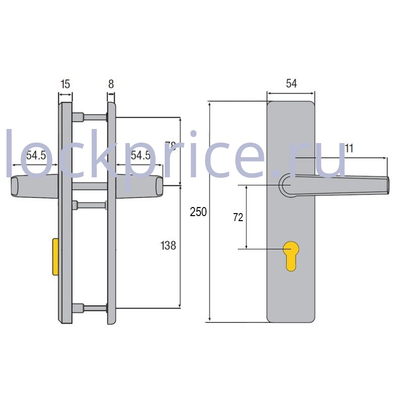 - Большие размеры накладки 250×54 мм перекрывают все старые технологические отверстия на двери и служат для защиты не только цилиндра, но и всего корпуса замка от высверливания.